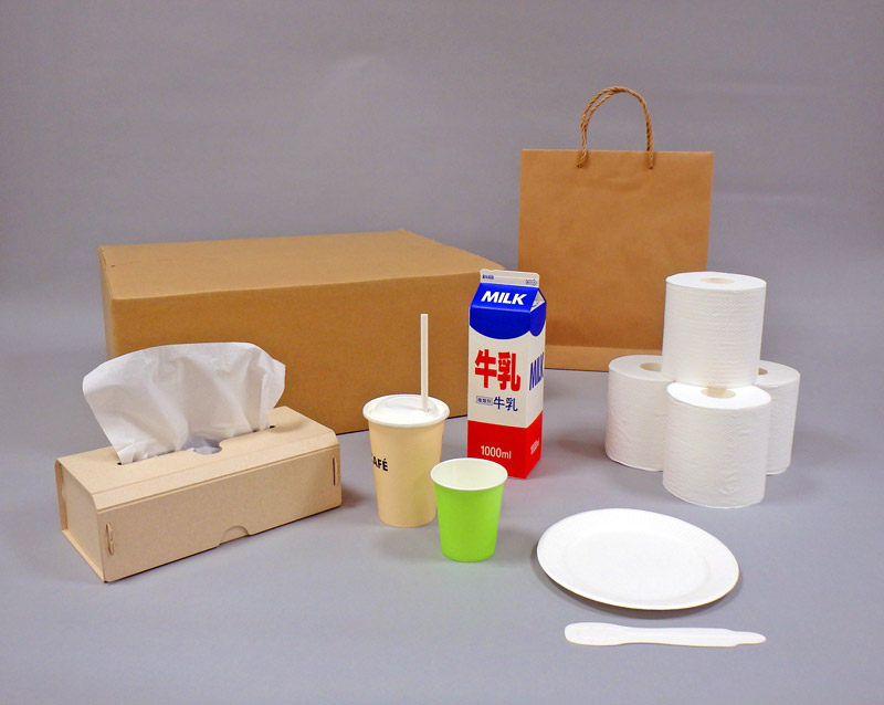展示では持続可能な社会に向け、環境負荷が少ない素材である紙の特性や、包装・衛生・物流など様々なシーンで暮らしを支えている紙、植物由来の新素材であるセルロースナノファイバー(CNF)などを、実物を交えて展示している。王子HDはCNFのサンプルや災害時に活躍する段ボールベッドなどを提供。日本製紙は、サンスクエア店舗でテスト中の全て紙でできている容器などを展示している。