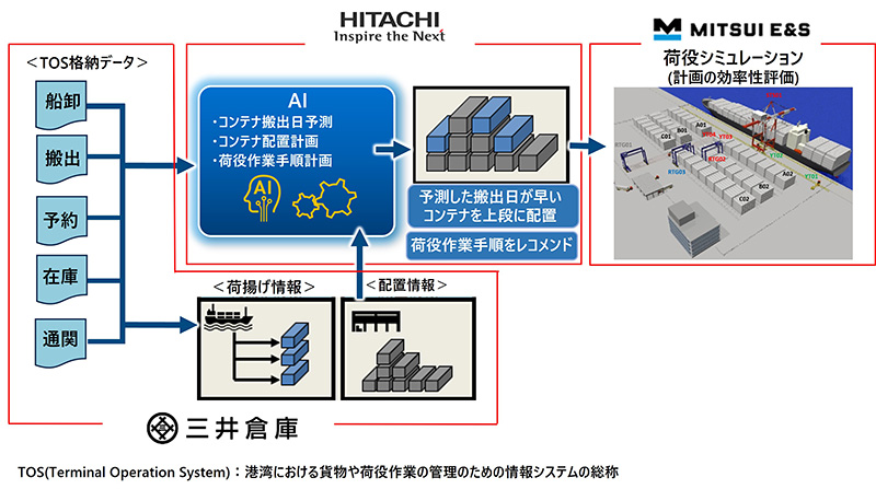 TOS市場でトップシェアの三井E&Sはコンテナ荷役に関するTOS機能の改修や荷役シミュレーションなどを担う。三井倉庫は長年にわたり培ってきた熟練プランナーの経験や知見を提供。日立製作所はAIの最適化技術及び荷役シミュレーターと連携する関連ソフトウェアを開発する。