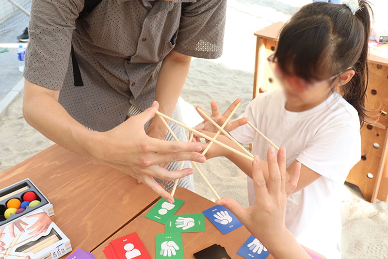 ごちゃまぜプレイパークの会場となったMIYASHITA PARKは三井不動産が運営する商業施設であり、多様な人々が行き交う渋谷という地域特性から、高橋さんの活動方針に合致する場として企画が進行した。今回は、MIYASHITA PARK 4階の多目的運動施設(サンドコート)に、遊具や教材の製作を手掛けるジャクエツの協力の下で様々な遊びを用意。他者と指同士を複数の棒でつないでいく「YUBIBO」やその全身版である「DEKABO」、目をつぶって手すりや足元の触覚をヒントに迷路のクリアを目指す「たっちパーク」などがあり、大勢の子供たちが夢中になって遊びまわった。