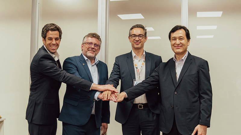 出資契約締結の調印式。(右から)磯野社長、Vale、Celulose Nipo-Brasileira、Bionowの各CEO