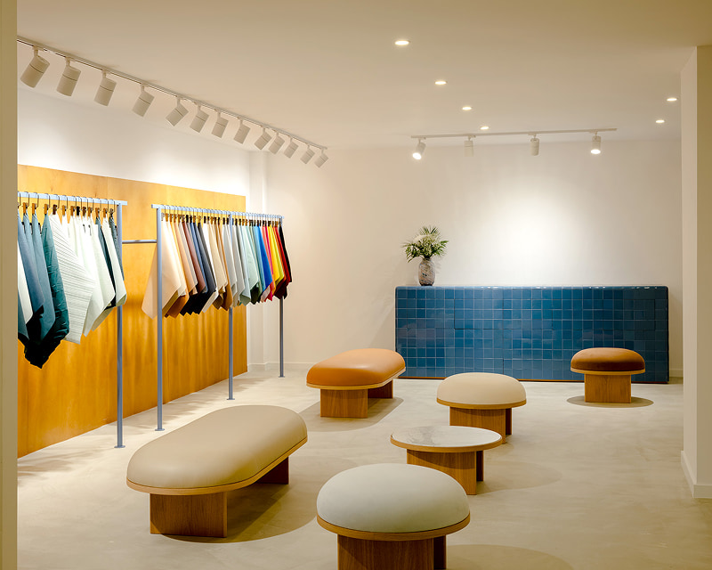 ショールームの空間デザインは、プロダクトデザイナーでポルトガル出身のルイ・ペレイラ氏と福定良佑氏が担当。両氏の多様な文化的背景を活かしてウルトラスエードの柔らかな風合いと高い機能性を最大限に引き立てる、洗練された展示空間を生み出している。