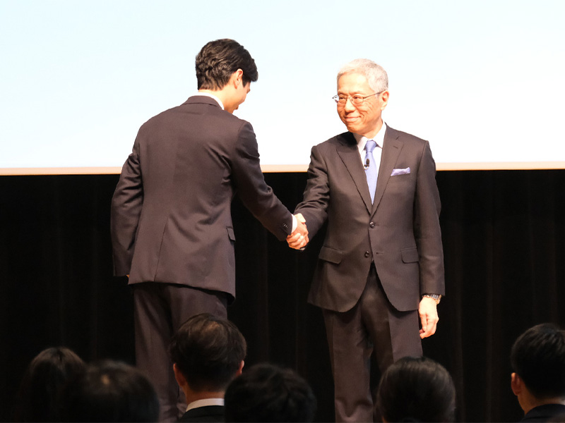 新入社員代表と握手を交わす堀社長(右)
