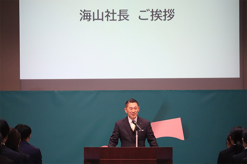 新入社員へ訓示する海山社長