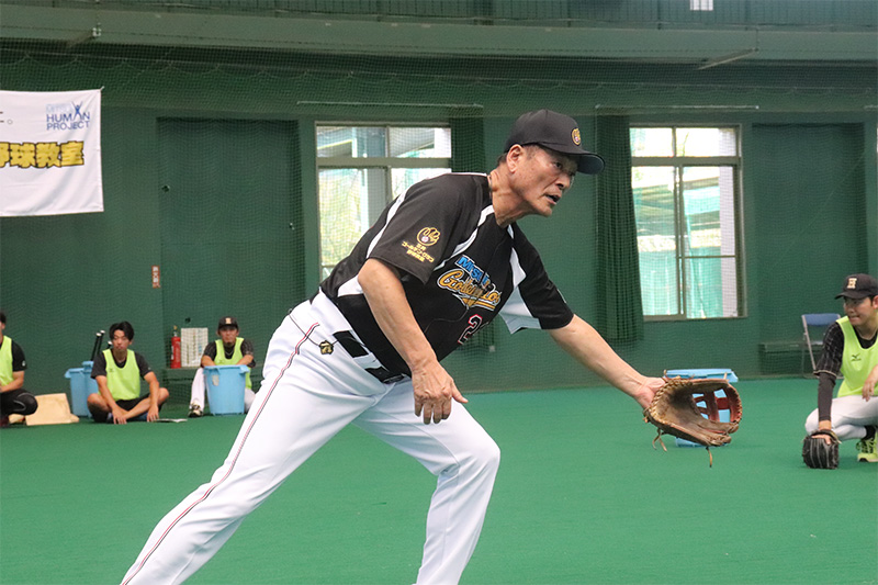 今回が初参加の中畑氏は、巨人時代に一塁手で7年連続受賞した名手。自身の経験を踏まえ「グラブを下から出すことを覚えて守備が上手くなった」と、練習方法のポイントを伝授した。紫原氏は現役さながらの軽快な動きで手本を示し、野球未経験者にもわかりやすく基本を伝えた。